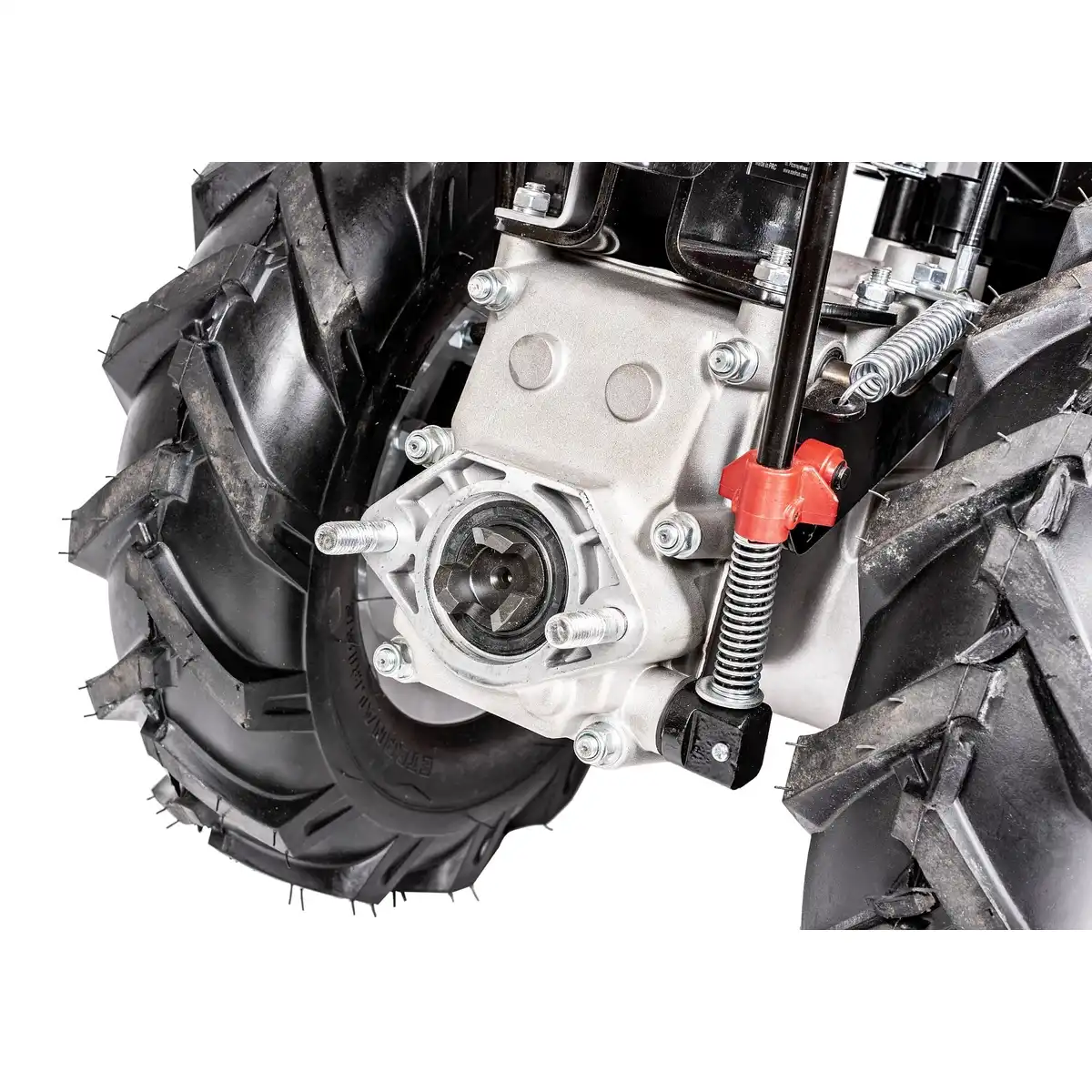 Napęd na koła zapewnia stabilne prowadzenie i ułatwia manewrowanie, szczególnie na cięższych odcinkach gleby. Regulowany uchwyt umożliwia dopasowanie pozycji roboczej do wzrostu operatora, co zwiększa komfort nawet podczas dłuższej pracy. Dzięki biegom wstecznym glebogryzarka jest łatwa do wycofania z trudniejszego terenu i precyzyjnego ustawienia na kolejnym przejeździe.